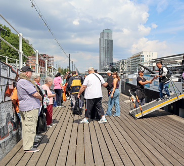 ! Due to high water levels or the type of vessel, the Waterbus cannot pass under the ‘pont des Armateurs’ on some days. Only in that case, the temporary stop ‘Place des Armateurs’ (stairs quai des Armateurs) will replace the stops quai des Péniches (KANAL-centre Pompidou) and Sainctelette (avenue du Port - parc Béco). You can see when this applies in the webshop when you book your tickets.